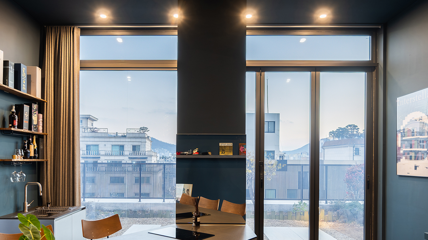 스위치를 켜면 테라스의 빛과 풍경을 그대로 받아들이고, 스위치를 끄면 시선을 차단해 공간의 밀도를 높입니다.